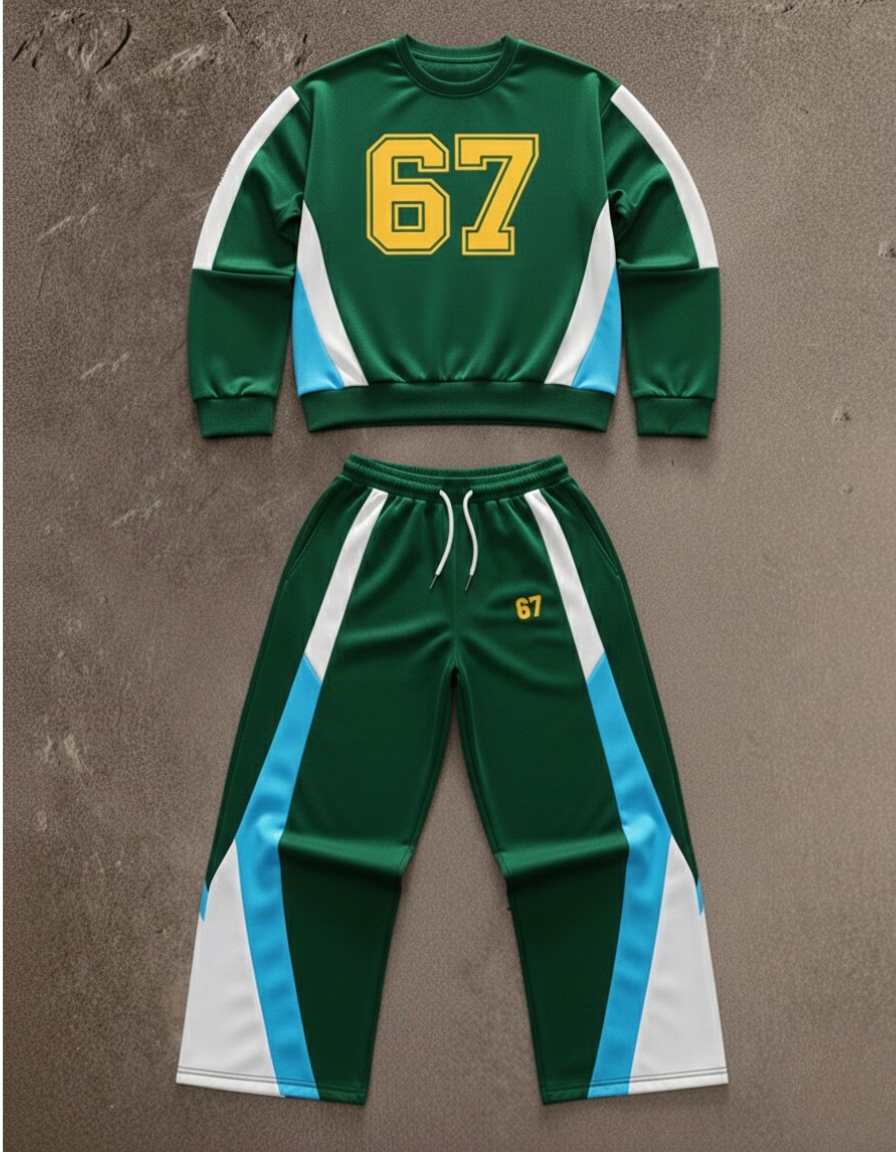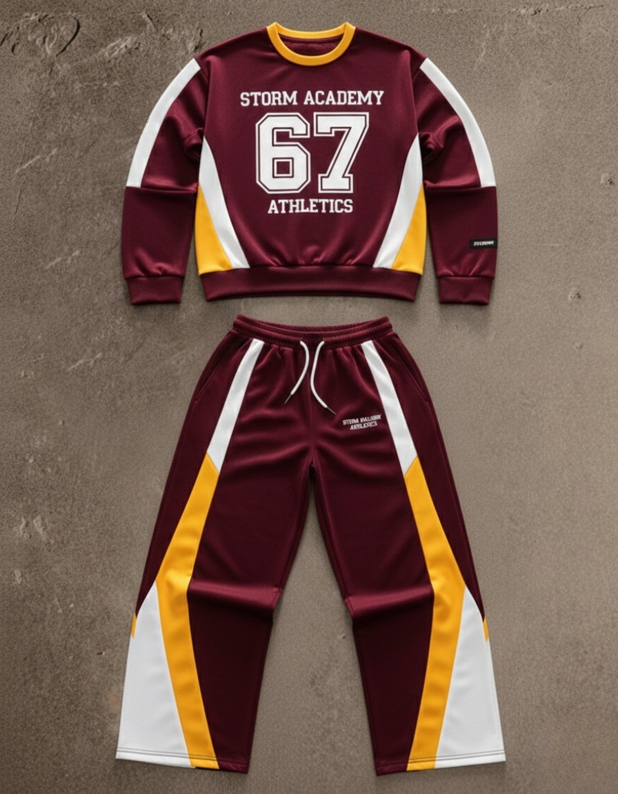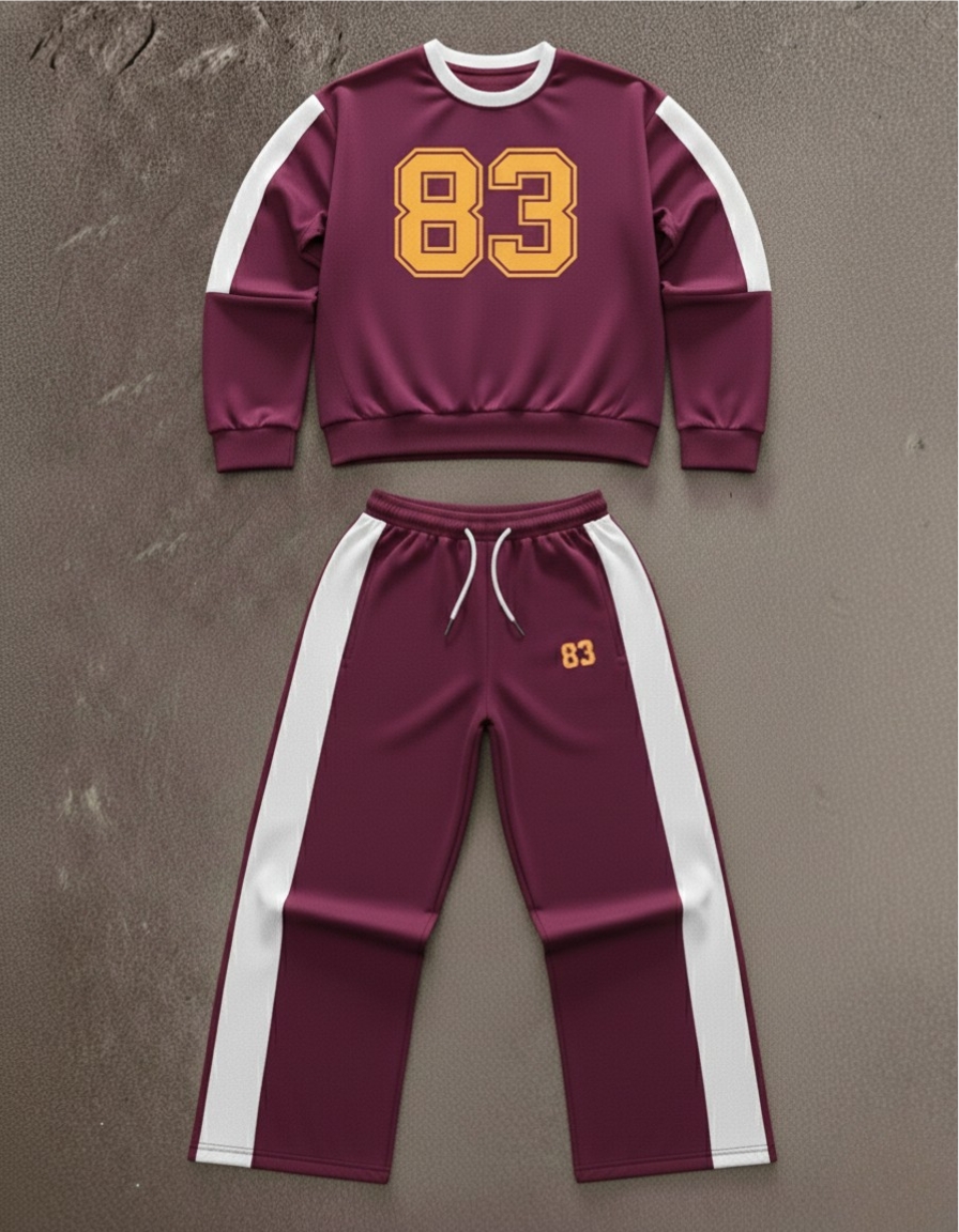 The sweatshirt features a bold sporty design with contrast panels, while the track pants come with a comfortable elastic waistband and sleek side detailing. Whether you’re heading out casually, traveling, hitting the gym, or styling a streetwear look, this tracksuit delivers a clean, confident appearance.